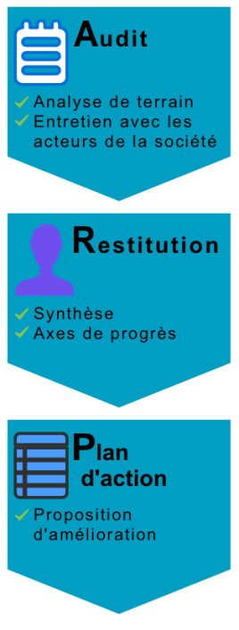 Le diagnostic débute par la réalisation d’un audit permettant d’évaluer le référentiel de départ de l’entreprise sur plusieurs critères. Cette sorte de « photographie de l’entreprise » servira de témoin pour mesurer son évolution tout au long de la mise en place de l’amélioration continue.