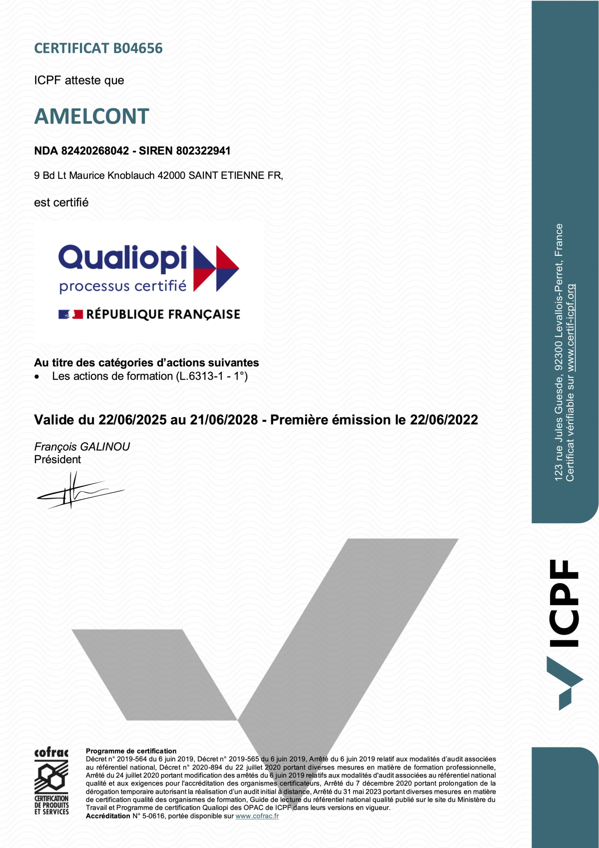 La certification QUALIOPI atteste la qualité du processus mis en oeuvre par AMELCONT pour ses actions de formation concourant au développement des compétences